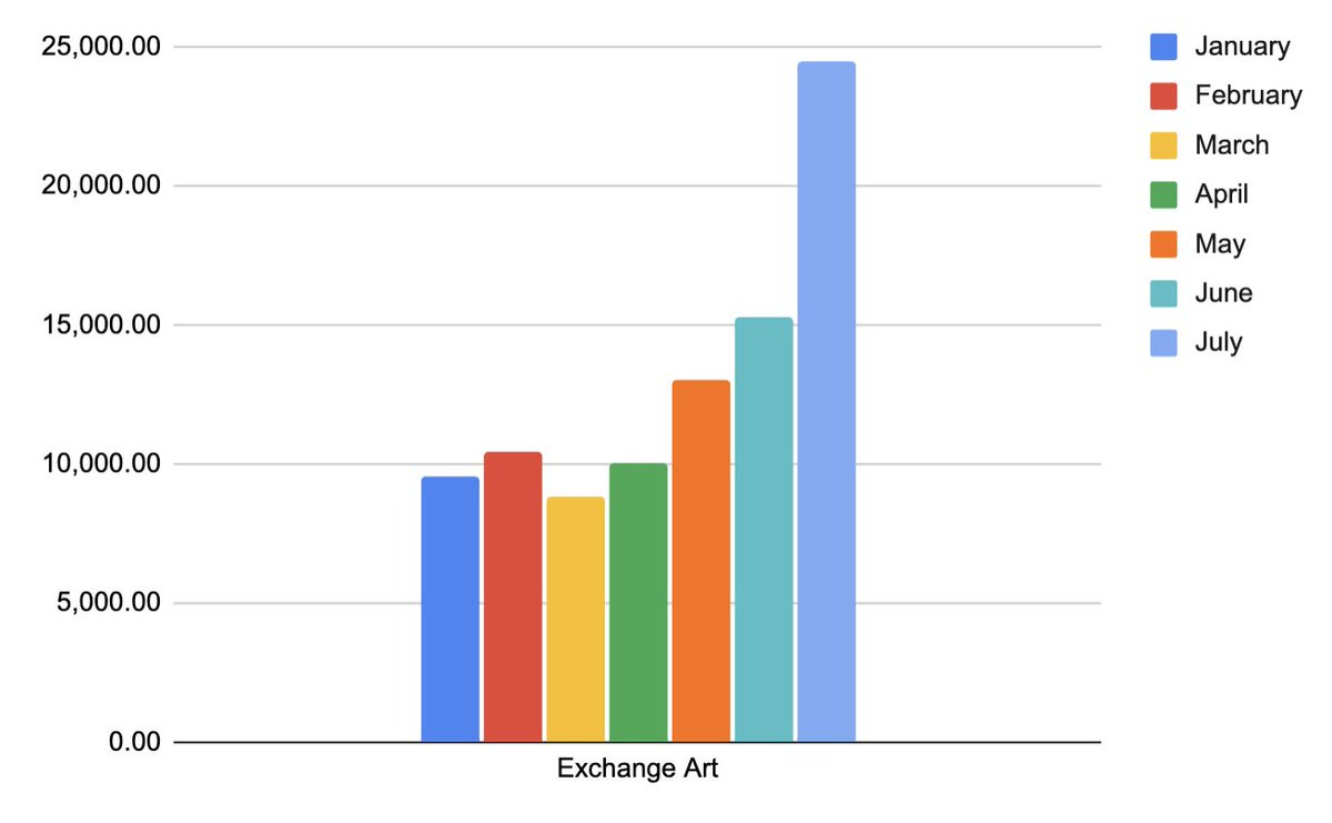 4. Another growth story came around from Solana, as Magic Eden’s volumes have been falling due to little speculative demand for PFPs right now, the art marketplace Exchange.Art (EA) has been making strides: EA hit sales of $SOL 16,800 for last month, finishing July with an 145% increase, ending up selling SOL 24,448.43 or ~ USD 887,000. It now has a market share of more than 80% in the Solana art NFT ecosystem.